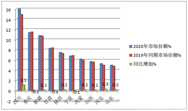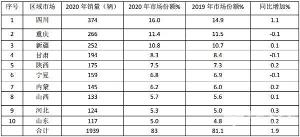 上图表可见,国六天然气客车不像新能源客车那样主要分布在长三角和珠三角等发达地区,而是个“小众市场”,2020年度国六天然气客车主要扎堆在天然气资源比较丰富、加气站网点较为密集的四川、重庆、新疆、甘肃、陕西、宁夏等区域。其中四川占比最高,达到16%,且同比增加1.1个百分点(增加最多),重庆、新疆分别位居第二和第三,TOP10累计占比超8成(83%),且同比增加1.9个百分点,区域市场集中度进一步提高。