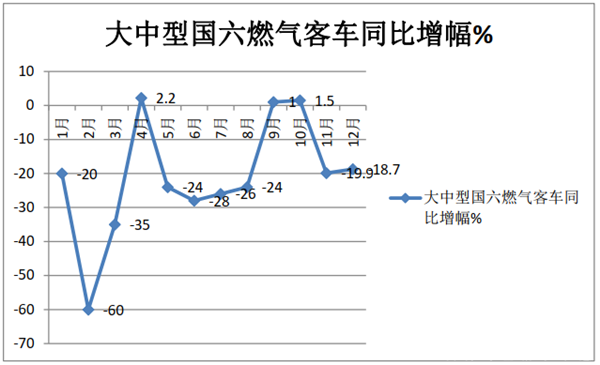根据中汽协数据统计,2020年1-12月各月国六天然气客车销售同比增幅: