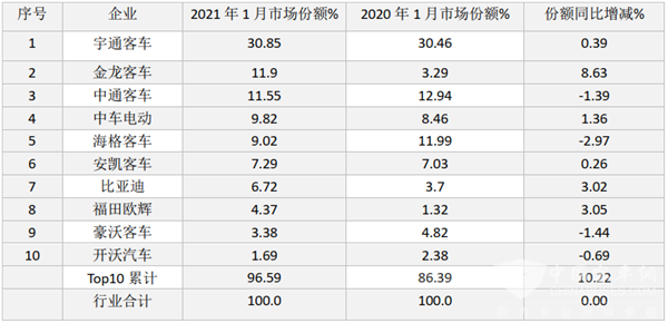 根据中国客车统计信息网数据,2021年1月新能源客车top10市场份额及同比变化情况: