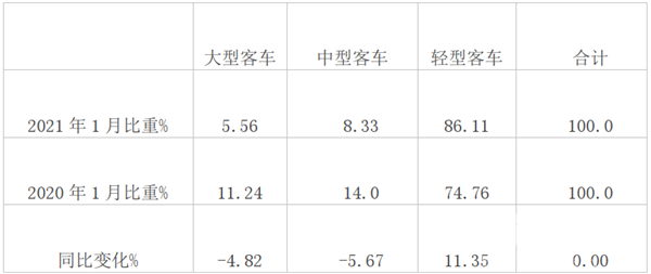 根据中汽协数据,2021年1月大中轻客车销量结构及同比变化:
