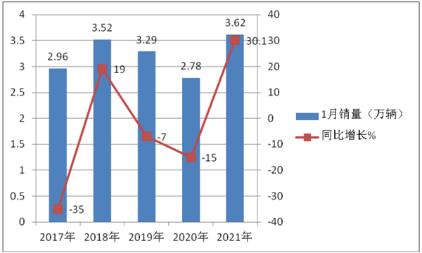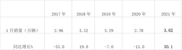 ●2021年1月客车销量及同比增幅均创近年同期新高
