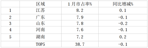 上图表显示,2021年1月轻型客车流向广东市场份额最大(主要是深圳和广东轻客物流车较多),同比增加0.4个百分点,其次是江苏区域市场,同比增加0.1个百分点 ;再次是山东区域,同比增加0.1个百分点。TOP5累计占比34.7个百分点,同比增加1.0个百分点。
