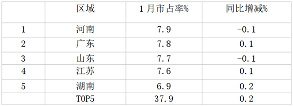 3、根据上牌信息统计,1月轻客车销量占比前5名区域: