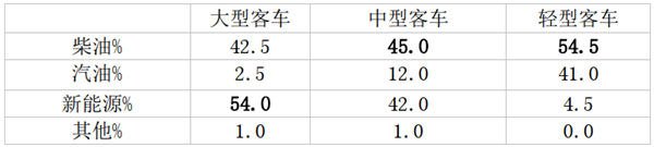 由上表数据可知,新能源在大型客车中占比最高(主要还是新能源大型公交多),次高是在中型客车中;在轻型客车占比最小;柴油类在轻型客车中占比最高,其次是在中型客车中;汽油类主要是在轻型客车中占比较高,其次是在中型客车中(主要是一些前置的中型商务接待车型,如7米丰田考斯特等)。