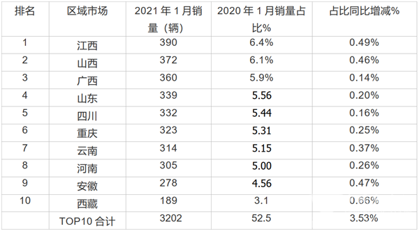 2021年1月,农村客运市场区域流向不均,TOP10累计占比超半壁江山(52.5%),其中江西、山西、广西位居前三甲。TOP10占比同比均有不同程度的增加,累计占比增加3.53个百分点,其中西藏占比同比增加最大(增加了0.66个百分点),说明国家对西藏地区扶贫的力度是最大的。