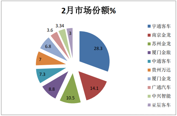 (一)2月:宇通同比增幅133%,领衔增长,占比近3成,居第一;南京金龙同比增长40%,跃居第二;苏州金龙同比增长142%,夺得第三;TOP10同比9增1降