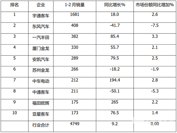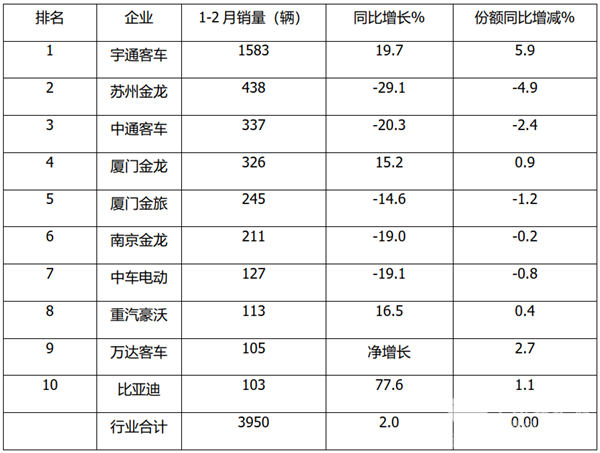 根据中汽协数据,2021年1-2月大型客车top10销量排行: