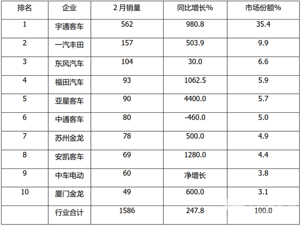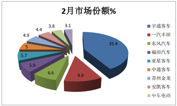 (一)2月:宇通稳居第一,销量同比大增980.8%,市场占比超三分之一,一家独大;一汽丰田和东风汽车分别位居第二和第三
