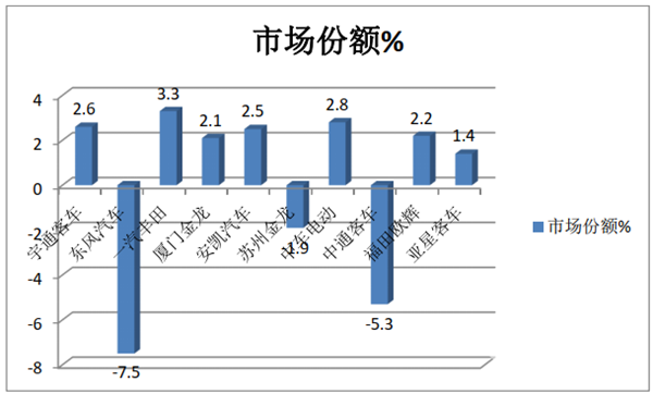 宇通客车销量1681辆,同比增长18%,位居老大,市场份额同比增加2.6个百分点,强者更强,老大地位愈发明显;东风汽车销量408辆,同比下降41.7%,位居第二,市场份额同比下降7.5个百分点,是份额同比下滑最大的企业;一汽丰田销量382辆,同比大增85.4%,居第三;市场份额同比增加3.3个百分点,表现不俗;厦门金龙销量330辆,同比大增55.7%,位居第四;市场份额同比增加2.1%,表现也比较出色;安凯客车销量289辆,同比大增79.5%,位居第五,市场份额同比增加2.4个百分点,表现较好。