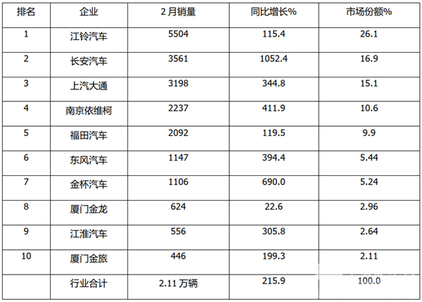 江铃汽车销量是2月销量唯一超过5000辆的企业,同比增长115.4%,也是轻客市场占比最大(26.1%)的品牌;长安汽车销量是3561辆,占比16.9%,位居第二,同比大涨1052.4%,位居行业同比增幅第一;上汽大通销量3198辆,同比增长344.8%,占比15.1%,居第三;南京依维柯汽车销量2237辆,同比增长411.9%,占比10.6%,位居第四;福田汽车销量2092辆,同比增长119.5%,占比9.9%,位居第五。