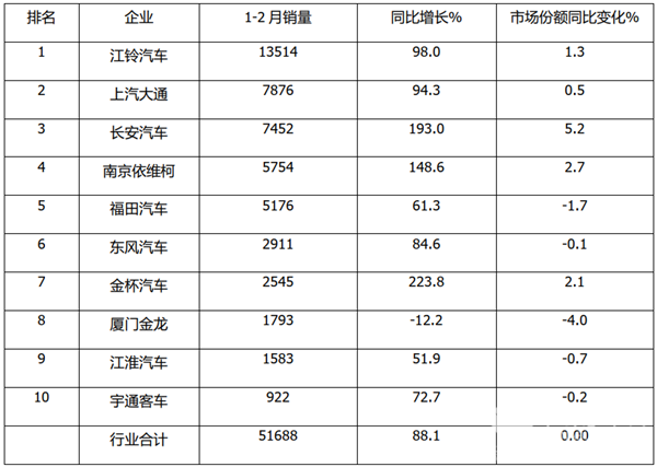 江铃汽车销量是1-2月销量唯一超过万辆的企业,同比增长98%,市场份额同比增加1.3%,强者更强明显;上汽大通销量7876辆,同比大涨94.3%,位居第二,市场份额同比增加0.5个百分点;长安汽车销量7452辆,同比增长193.0%,居第三,市场份额图增加5.2%,市场top10中份额增加最大的企业,表现出色;南京依维柯汽车销量5754辆,同比增长148.6%,位居第四,市场份额同比增加2.7%,表现不错;福田汽车销量5176辆,同比增长61.3%,位居第五,市场份额同比减少1.7个百分点。
