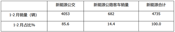 上图表可见,在2021年1-2月新能源客车销量中,新能源公交占比85.6%,占据绝对优势,新能源公路客车占比只有14.4%,处于从属地位。