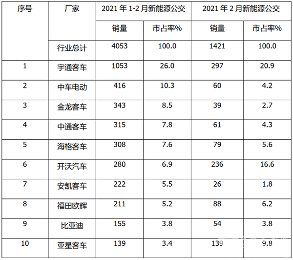 从上图表看出,2021年2月及1-2月,在新能源公交客车主流企业销量TOP10中特点分别如下: