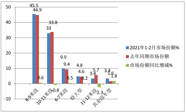 上图表可见,在2021年1-2月新能源公交客车各长度段(细分车型)销量占比中,呈现以下特点:
