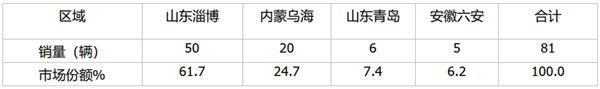 上图表可见,2021年2月燃料电池汽车流向四个城市,其中山东淄博销量50辆,占比超6成(61.7%),位居第一;其次是内蒙的乌海,销量20辆,占比超2成(24.7%),居于第二;销往山东的青岛6辆,占比7.4%,位居第三;销往安徽六安5辆,占比6.2%,位居第四。