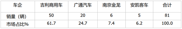 上图表可见,2021年2月燃料电池汽车流主要有四个车企销售,其中吉利商用车销量50辆,占比超6成(61.7%),位居第一;其次是珠海广通汽车,销量20辆,占比超2成(24.7%),居于第二;南京金龙销售6辆,占比7.4%,位居第三;安凯客车销售5辆,占比6.2%,位居第四。