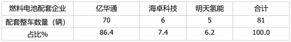 根据势银能链(TrendBank)统计数据,从配套企业来看,2021年2月销售的81辆燃料电池汽车由亿华通、明天氢能、海卓科技等三家企业配套,其中,亿华通配套数量,均为第一;海卓科技装机量与配套数量都位列第二。