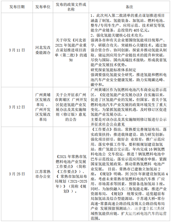 在氢能产业方面,河北、广东广州、江苏常熟等省市地区发布氢能产业发展相关文件,内容包含加氢站建设及运营补贴、燃料电池汽车发展、氢能供应链发展、氢燃料汽车推广等内容。