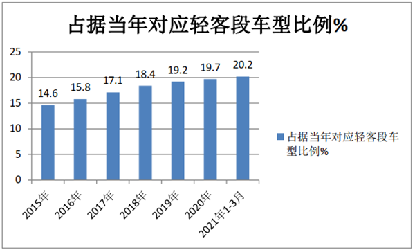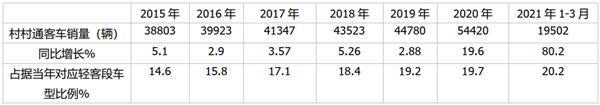 上图表可见,在2021年一季度,农村客车市场累计销量19502辆,同比同比增长80.2%,占据同类车型轻客市场的比例也达到了20.5%,比去年提高了0.5个百分点,也就是说2021年1-3月,无论是销量、同比增幅还是占据轻客市场比例,农村客车市场均创近年新高。