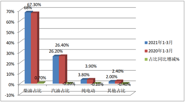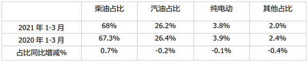 上牌数据显示,2021年1-3月及2020年同期,农村客运市场中销量占比最大的是柴油动力车型,其次为汽油。柴油占比近7成,且同比增加0.7个百分点,纯电动占比最小,且同比减少0.1%