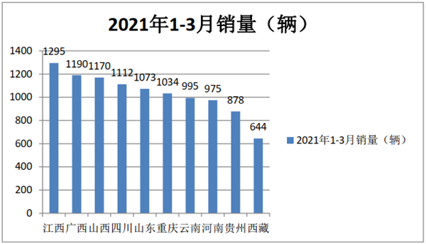 ●一季度,农村客车销量区域流向不均,TOP10中,江西占比最大,西藏占比同比增加最多