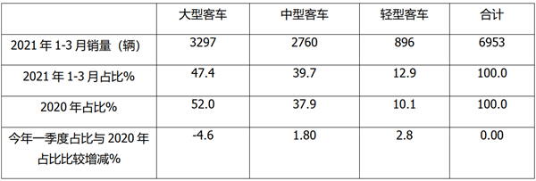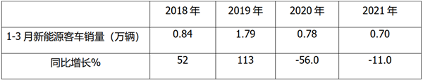 上表可见,2021年一季度新能源客车终端上牌销量在近4年同期中处于最低,同比增长-11%,在近年同期中居于第二低,如果剔除去年一季度疫情的特殊情况因素,可以认为今年一季度新能源客车终端市场较差,处于今年同期较低水平。