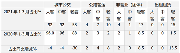 根据中国汽车流通协会数据,2021年一季度按目标用途划分,新能源客车销量结构及同比变化情况: