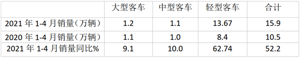 根据中汽协数据统计,2021年1-4月大中轻客车销量同比如下:
