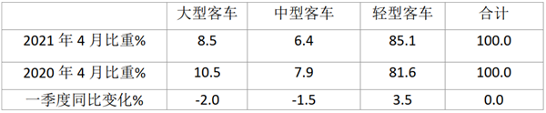 据中汽协数据,2021年4月大中轻客车销量结构及同比变化: