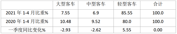 据中汽协数据,2021年1-4月大中轻客车销量结构及同比变化: