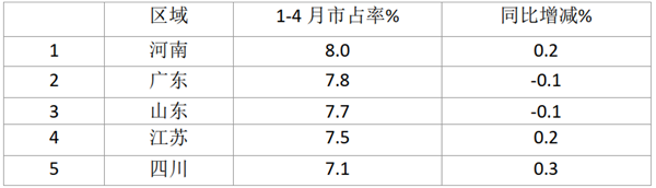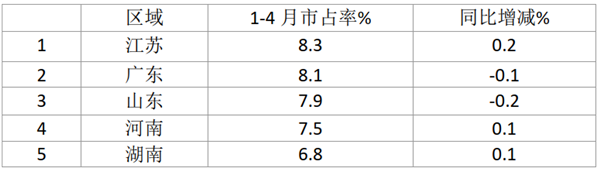 1、2021年1-4月大型客车市占率前5名区域(来自各地终端上牌信息)