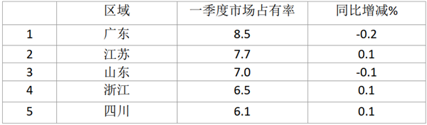 3、轻型客车市场份额前5名区域:(来自各地终端上牌统计计算)
