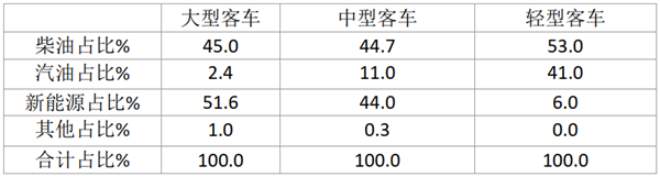 由上表数据可知,新能源在大型客车中占比最高(主要还是新能源大型公交多),次高是在中型客车中;在轻型客车占比最小;柴油类在轻型客车中占比最高,其次是在中型客车中;汽油类主要是在轻型客车中占比较高,其次是在中型客车中(主要是一些前置的中型商务接待车型,如7米丰田考斯特等)。