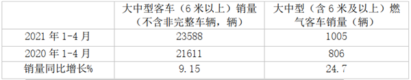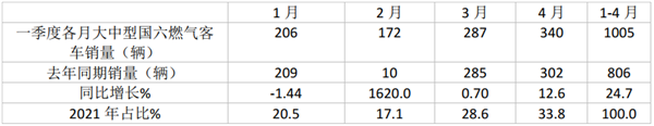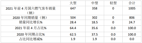 2021年前4月国六燃气客车市场同比大增24.7%,,比同期大中型客市场的增幅高15.55个百分点,也就是说2021年前4月国六天燃气客车市场跑赢大中型客车整体市场。