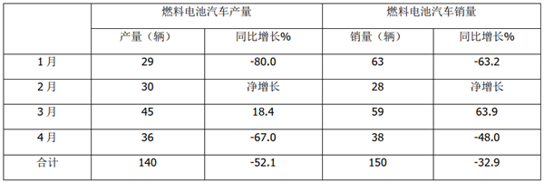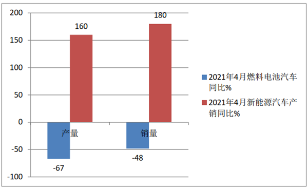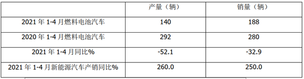 根据中汽协数据,2021年4月燃料电池汽车产销同比统计: