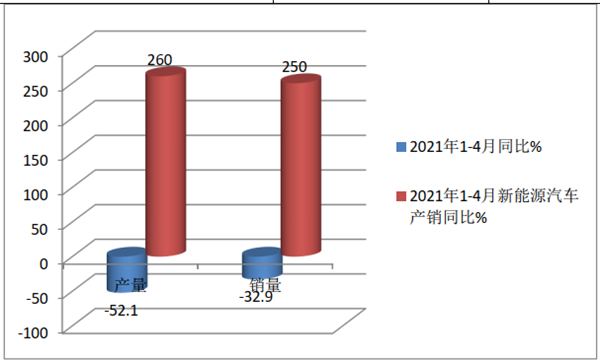 特点二:2021年前4月燃料电池汽车累计产销同比分别下降52.1%和32.9%,跑输前4月新能源汽车产销市场大盘