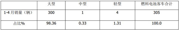 上图表显示,在2021年前4月燃料电池客车终端销量中,大型燃料电池客车累计上牌销量300辆,占比98.36%,可谓一家独大,一骑绝尘,而中型燃料电池客车只有1辆,占比只有0.31%,最小的是轻型燃料电池客车也只有4辆,占比1.31%。