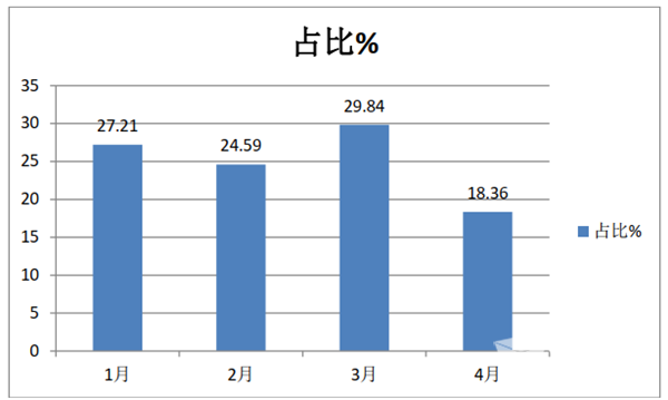 上图表可见,2021年1-4月中,3月燃料电池客车上牌销量最大,为91辆,占比近3成(29.84%);其次是1月上牌销量为83辆,占比为27.21%,再次是2月,上牌数量为75辆,占比为24.59%;最少的是4月上牌数量只有56辆,占比为18.36%。