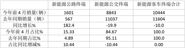 2021年前4月新能源公路客车终端销量、同比及占比增减:
