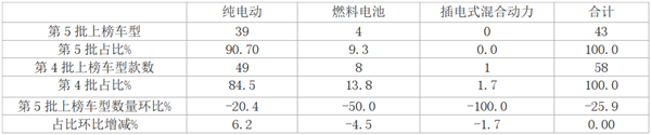 纯电动客车入选车型39款,数量环比下降20.4%,占比90.7%,占据老大地位,且占比环比增加6.2个百分点,是占比环比增加最大的车型;