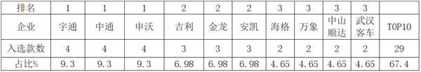 宇通客车、中通客车、申沃客车均上榜4款,并列位居第一,占比均9.3%;吉利商用车、金龙、安凯并列位居第二,均上榜3款,占比均为6.98%,海格、万象、中山顺达及武汉客车均上榜2款,并列第三,占比均为4.65%,TOP10累计上榜29款车型,占比67.4%,可见本批次上榜的企业不少,集中度较高。