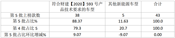 ●上榜车型中,符合财建(2020)593号补贴政策的车型为38款,占比近9成,占据主体地位,且环比增加9.07%