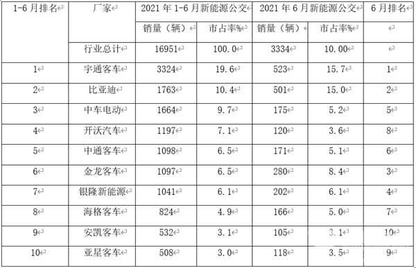 从上表看出,2021年6月及1-6月,在新能源公交客车主流企业销量TOP10中特点分别如下: