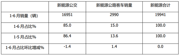 在2021年1-6月新能源客车销量中,新能源公交占比85.0%,虽仍占据绝对优势,但环比1-5月下降了1.4个百分点;而新能源公路客车占比15%,环比1-5月提高了1.4个百分点。