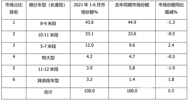 特点四、从细分车型看,2021年前6月8-9米段是最受市场青睐的车型,占比超4成,但占比同比减少0.9%;其次是10-11米车型,占比超3成,但占比同比也减少0.7%;5-7米占比居第三,但占比同比增加2.3%,是占比增加最多的细分车型,“大转小”迹象明显