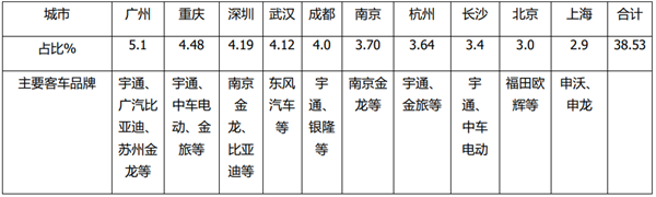 广州拔得头筹,占比5.1%;重庆位居第二,占比4.48%;深圳位居第三,占比4.19%;TOP10累计占比38.53%,说明今年上半年新能源公交客车销量流向不均。