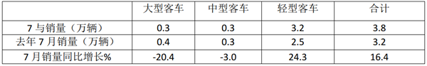 ●7月客车销量同比增长16.4%;大型客车同比下降20.4%,中型客车同比下降3%;轻型客车是唯一同比增长(24.3%)的细分车型,也是拉动7月客车市场增长的唯一动力