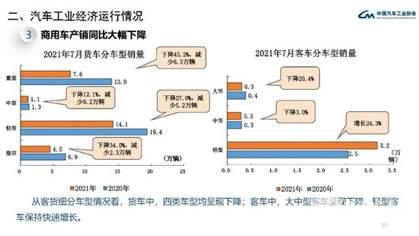 根据中汽协数据,2021年7月及1-7月客车、货车、商用车同比增幅比较: