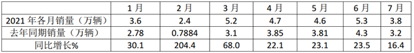 1-7月各月销量同比均增长,可谓全线飘红,其中同比增长最大的是2月(204.4%),主要是去年2月由于受到疫情的严重影响,销量基数太低导致的,同比增幅最小的是7月(16.4%)。