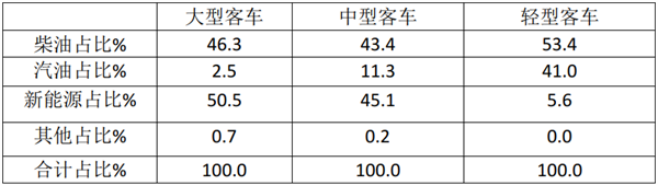由上表可知,新能源在大型客车中占比最高(主要还是新能源大型公交多),次高是在中型客车中;在轻型客车占比最小;柴油类在轻型客车中占比最高,其次是在中型客车中;汽油类主要是在轻型客车中占比较高,其次是在中型客车中(主要是一些前置的中型商务接待车型,如7米丰田考斯特、宇通T7等)。